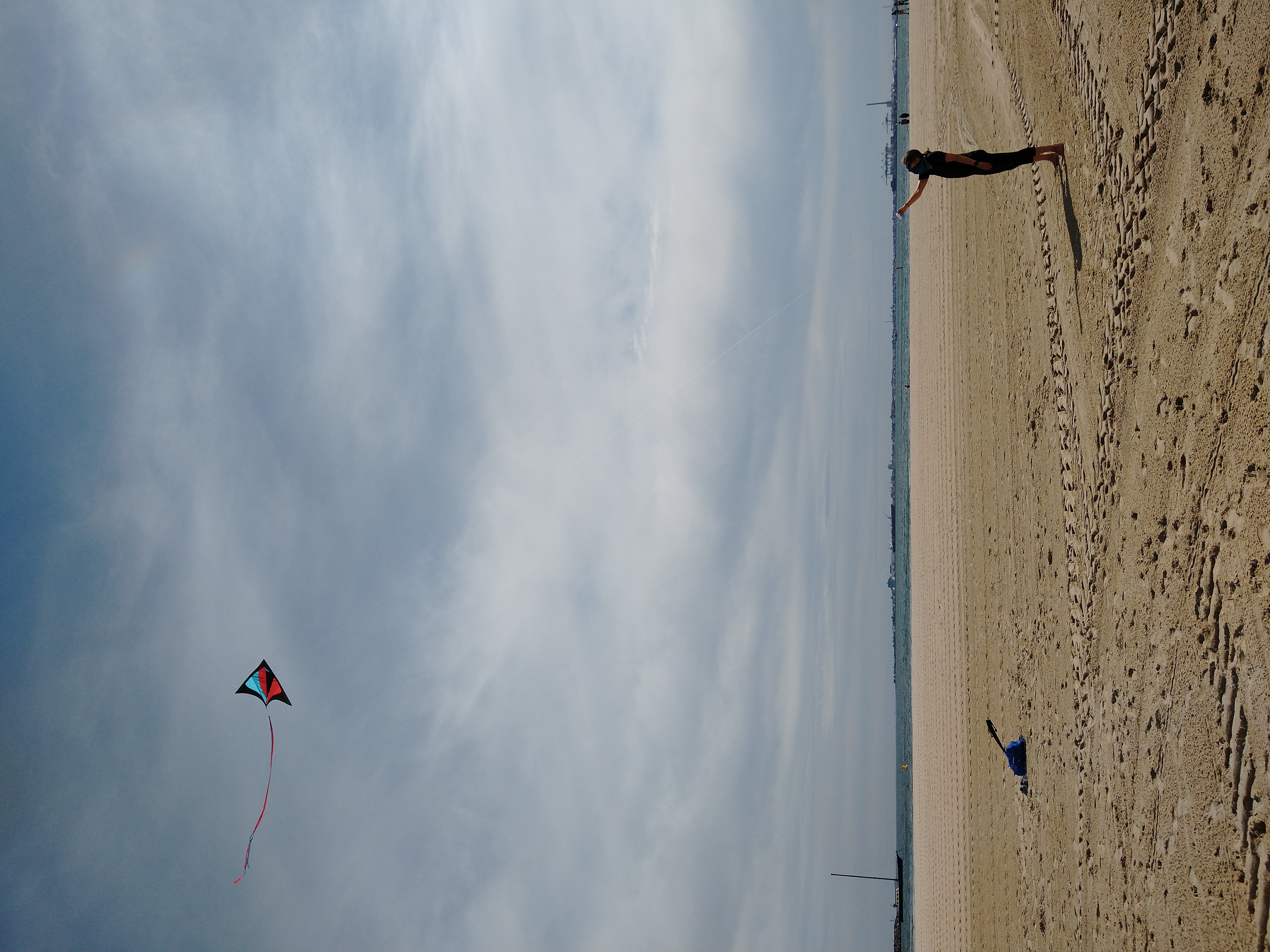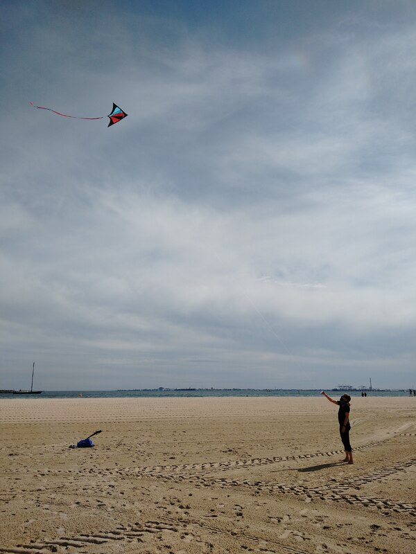 When things started to slowly open up after Melbourne's stage 4 lockdown we started to have a few more options for meeting outside. I wasn't able to see anyone during the hard 6 week lockdown as I didn't have any friends within my 5km radius whom I could meet with and get home again within an hour. When these restrictions eased a little I was able to meet my friend Sarah at the beach. She had bought a kite during lockdown because she was bored and had always wanted to try flying a kite. She even wrote in to the ABC Live Blog to ask if flying a kite was acceptable as outdoor exercise. This is her with her kite.