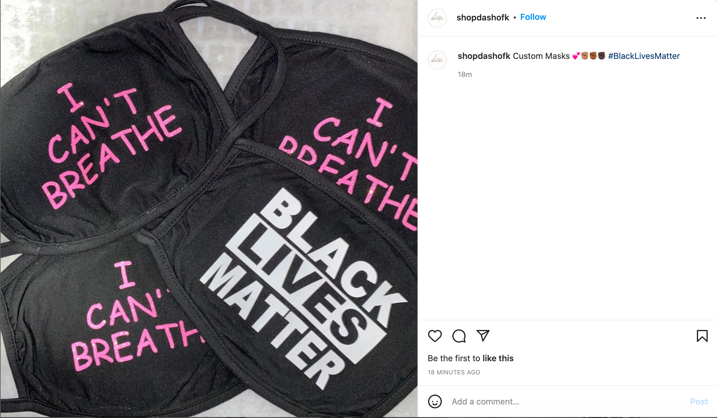 This is an Instagram post by shopdashofk. This is a post on custom masks with the words "Black Lives Matter" and "I Can't Breathe" written on them. These masks are meant to send a message on racial disparities between Black people and those of other races. Writing messages on masks has been a trend across all political spectrums, with some choosing different slogans or symbols to use, in order to send messages much like the masks featured here. This evokes some of the larger culture surrounding mask wearing in general, where they have been used much like graphic t-shirts to say messages people want heard. It is a new social phenomenon that has come with the pandemic, and it is still popular among some people.