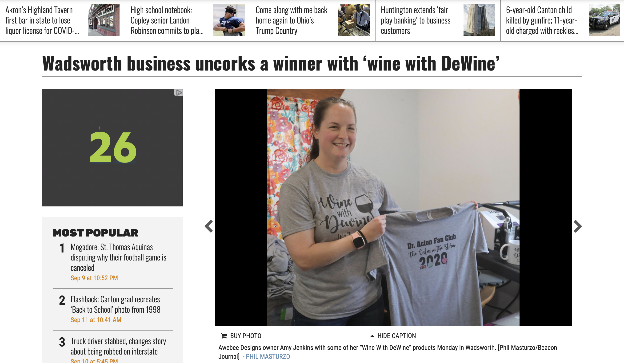 Article about the growing popularity of "Wine with DeWine" memorabilia in Ohio. It is in reference to the daily 2PM EST COVID 19 meetings Ohio's Governor Mike DeWine has. This article discusses a business that helped make this trending merchandise popular. -