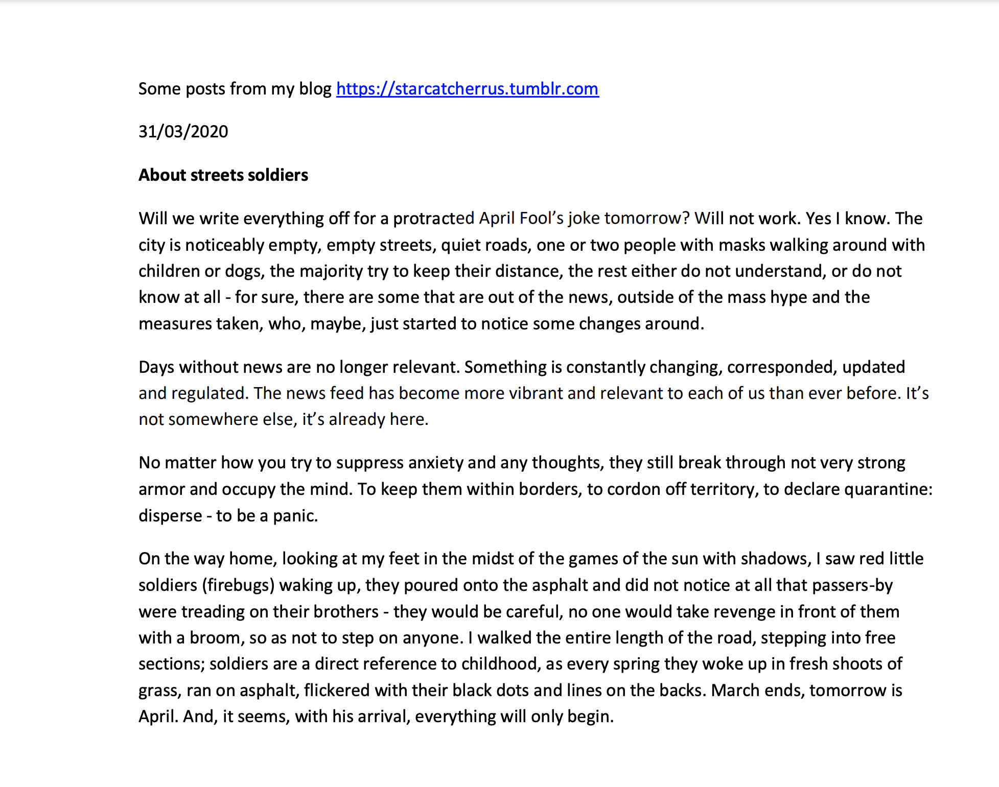 My name is Egor and i write my thoughts and emotions in my blog https://starcatcherrus.tumblr.com every day for more than 6 years. And i want to share some of posts about life in self-isolation. And also i'm working in a city hospital as a radiologist. -