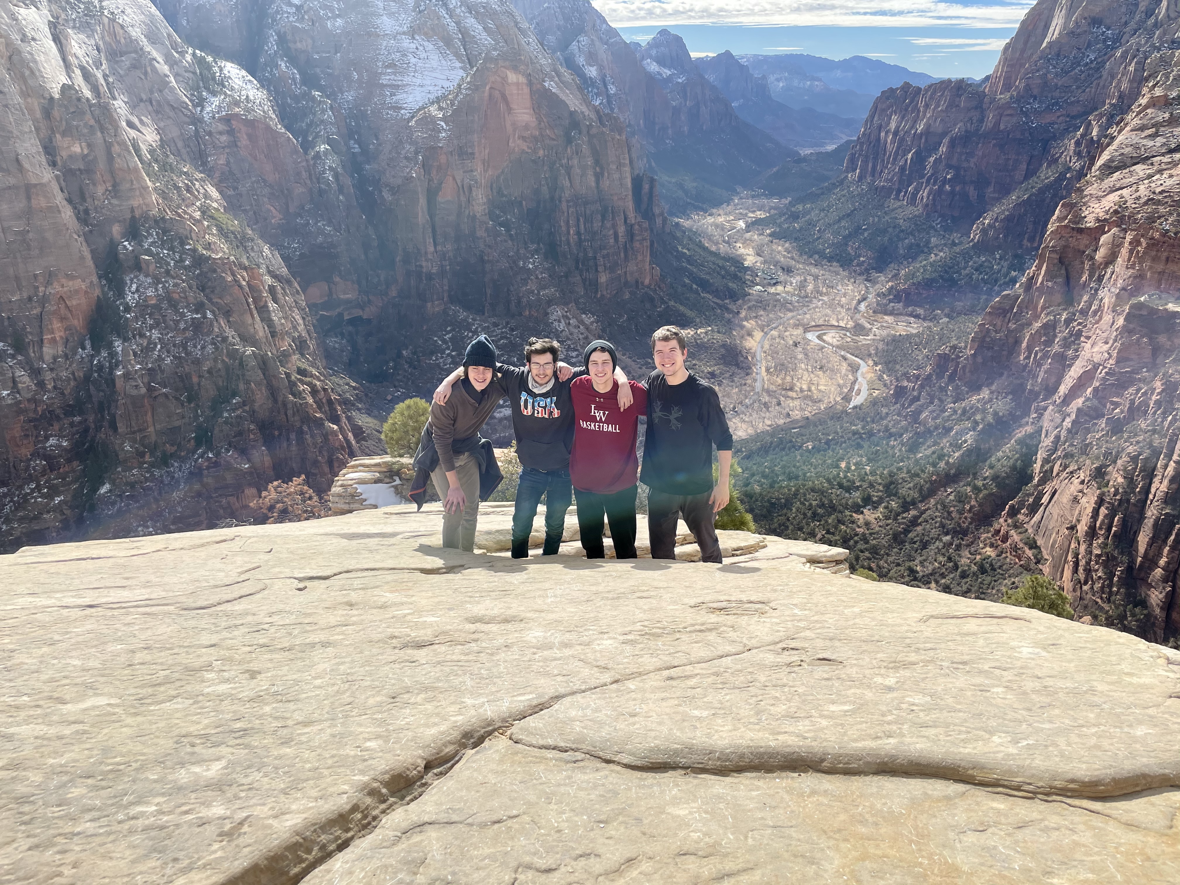 For the majority of the Covid lockdowns, I lived with two of my best friends in an apartment in Fayetteville, Arkansas. This occurred while I was finishing my senior year of college. I did not do much long distance traveling prior to this, but the pandemic gave me a desire to travel to my friends and me. So, once travel restrictions started to lift we planned a trip to Zion National Park in Utah, a place all of us wanted to go beforehand. We spent New Years Day traveling and spent the first week of January 2022 in freezing cold temperatures in Utah (as it made the camp site rental prices shoot way down.) It's a trip that still comes to mind frequently as I enjoyed it immensely. The attached photo is of the four of us atop Angel's Landing, one of the more famous hiking spots in the park. While Covid negatively affected much, the desire to travel more is something I am very grateful to have obtained.