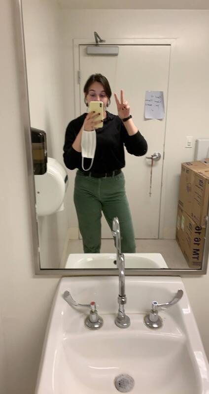 The next photo is when I was allowed to return to work. I worked in retail, and we were required to wear masks and gloves while on shift. We had very intense cleaning protocols and closed fitting rooms to prevent the spread of COVID-19. This picture was taken in the employee restroom August 29th, 2020.