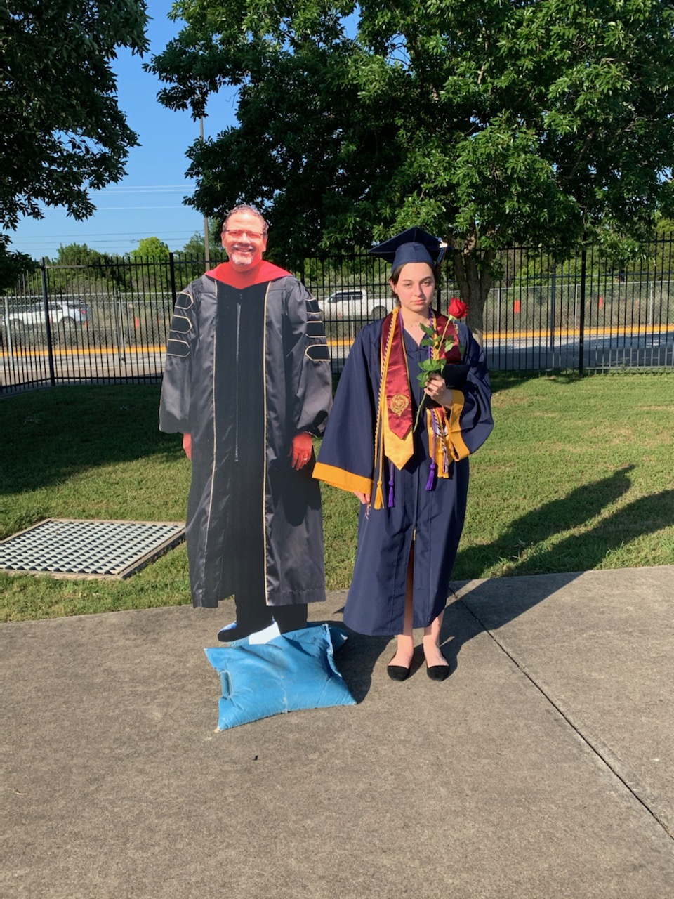 I graduated from high school in Spring 2020, during the height of the pandemic. The first photo is me at my high school graduation. Because of social distancing protocols, our graduation was scheduled for the full day at a football stadium, where students were lined up by last name and called to the stage. Once we received our diplomas, we walked back to our cars, where we had to leave. In all honesty, this was very efficient and I enjoyed this way of graduating. I took an unhappy picture with my "principal" as a cardboard cut out and returned home to celebrate.