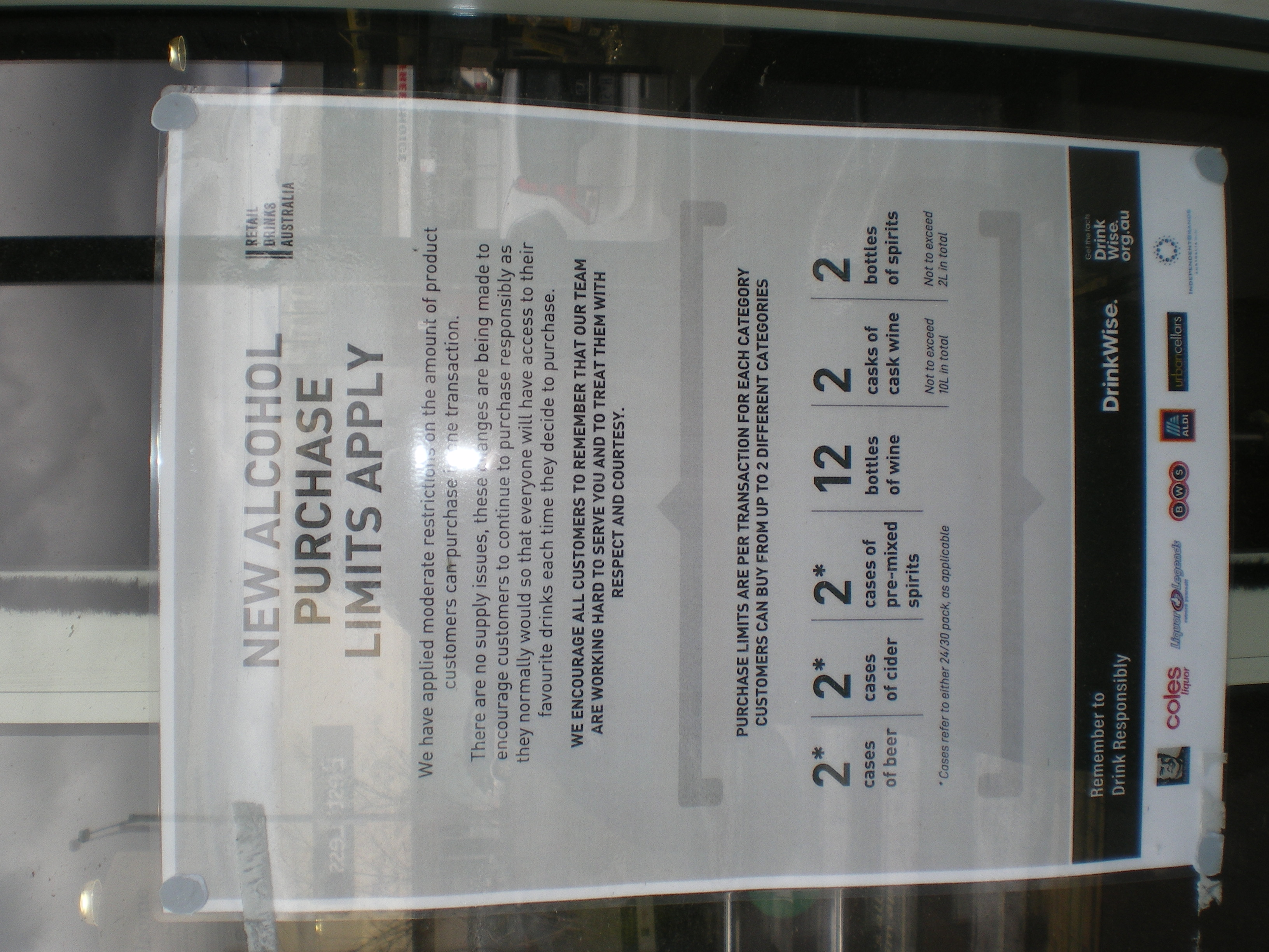Notice shows restriction on how much alcohol can be bought in Australia from liquor outlets. The amount had been reduced from previous week.