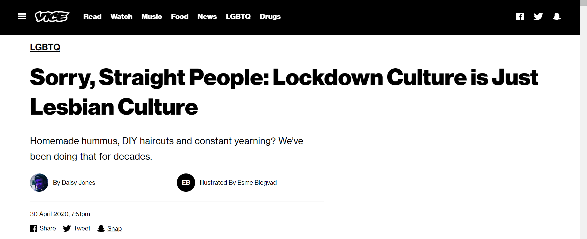 An article on how elements of 'lockdown culture' are attitudes and pasttimes commonly attributed to the lesbian experience.