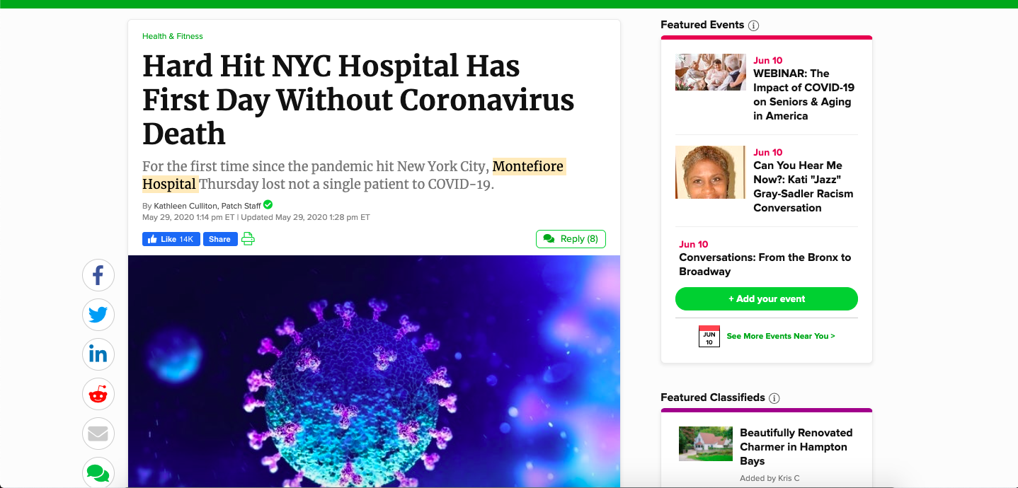 For the first time since the pandemic hit New York City, Montefiore Hospital Thursday lost not a single patient to COVID-19, indicating a possible end in sight for the pandemic in New York.