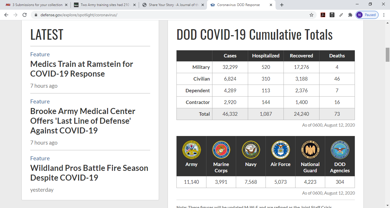 This is an update of the number of coronavirus cases in the military.It shows a significant difference between the military branches with the army leading with the highest number of cases.