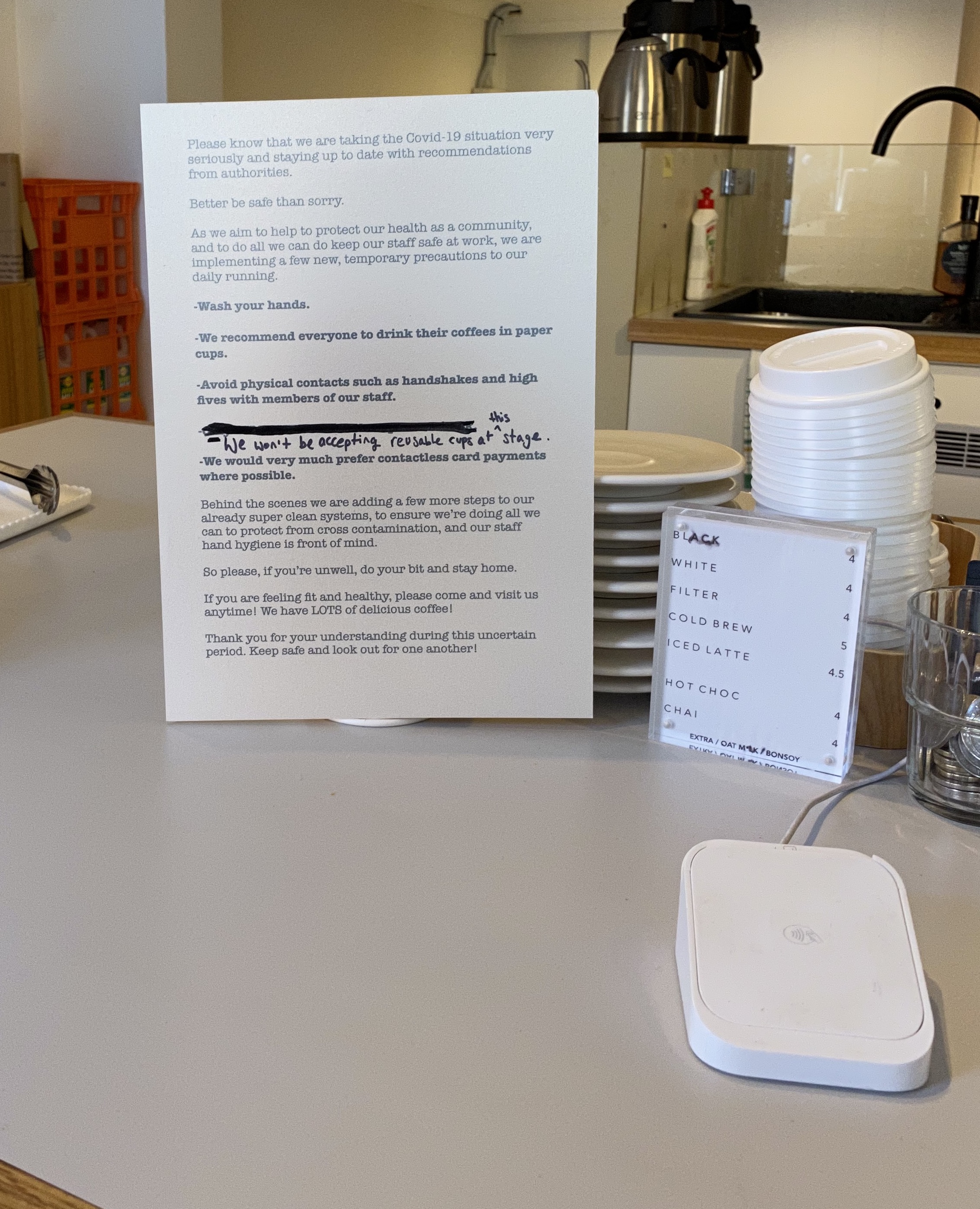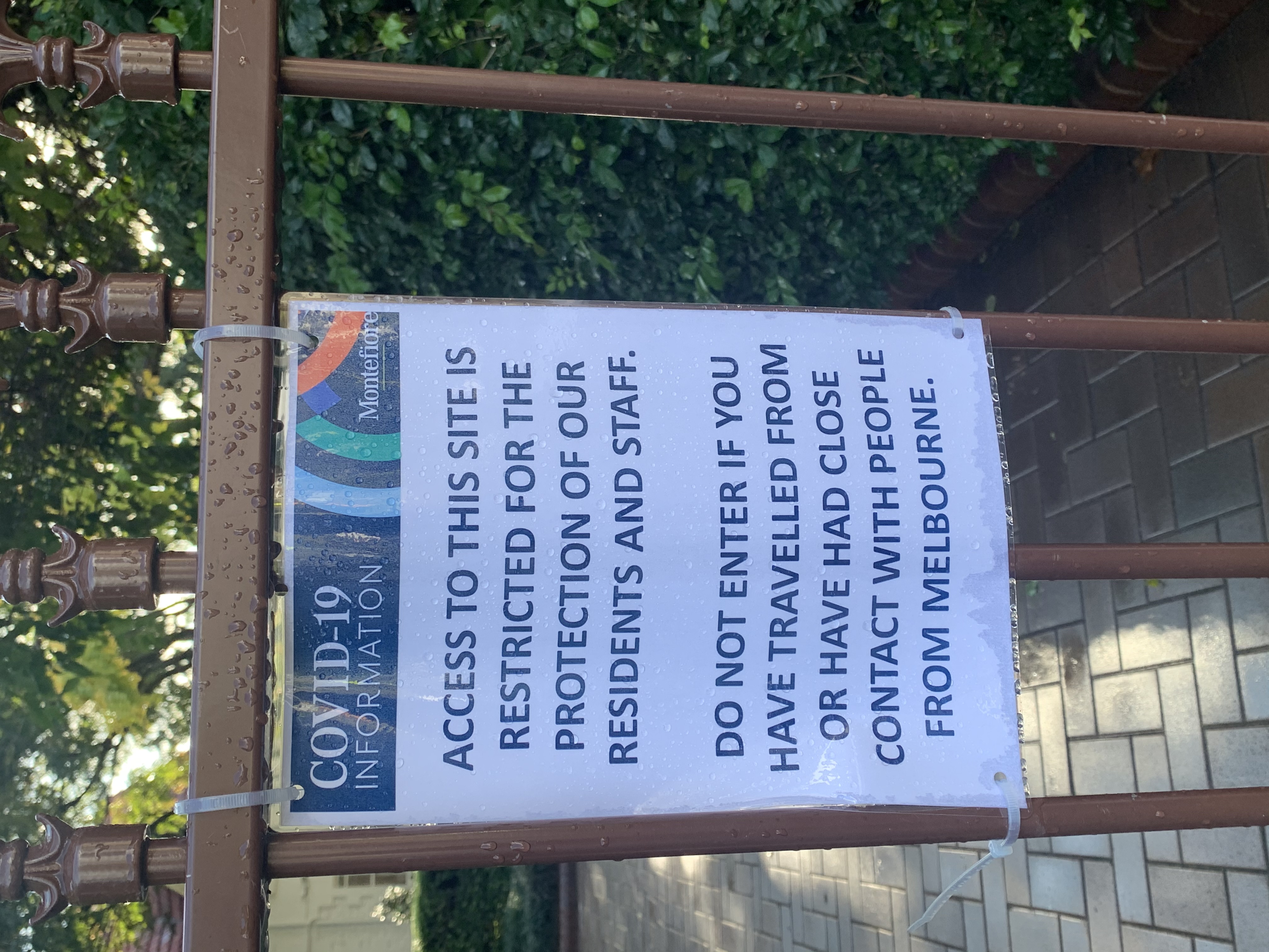 While COVID-19 restrictions became part of the everyday, it was at times difficult to keep track of their constant changes and revisions. Businesses started to put up signs outlining their policies for staff and clients to keep everyone safe. The first image is from a cafe in Potts Point, one of many local businesses put under strain by the pandemic. The second is from an aged-care facility in Woollahra in response to the beginning of the second-wave outbreak in Melbourne.