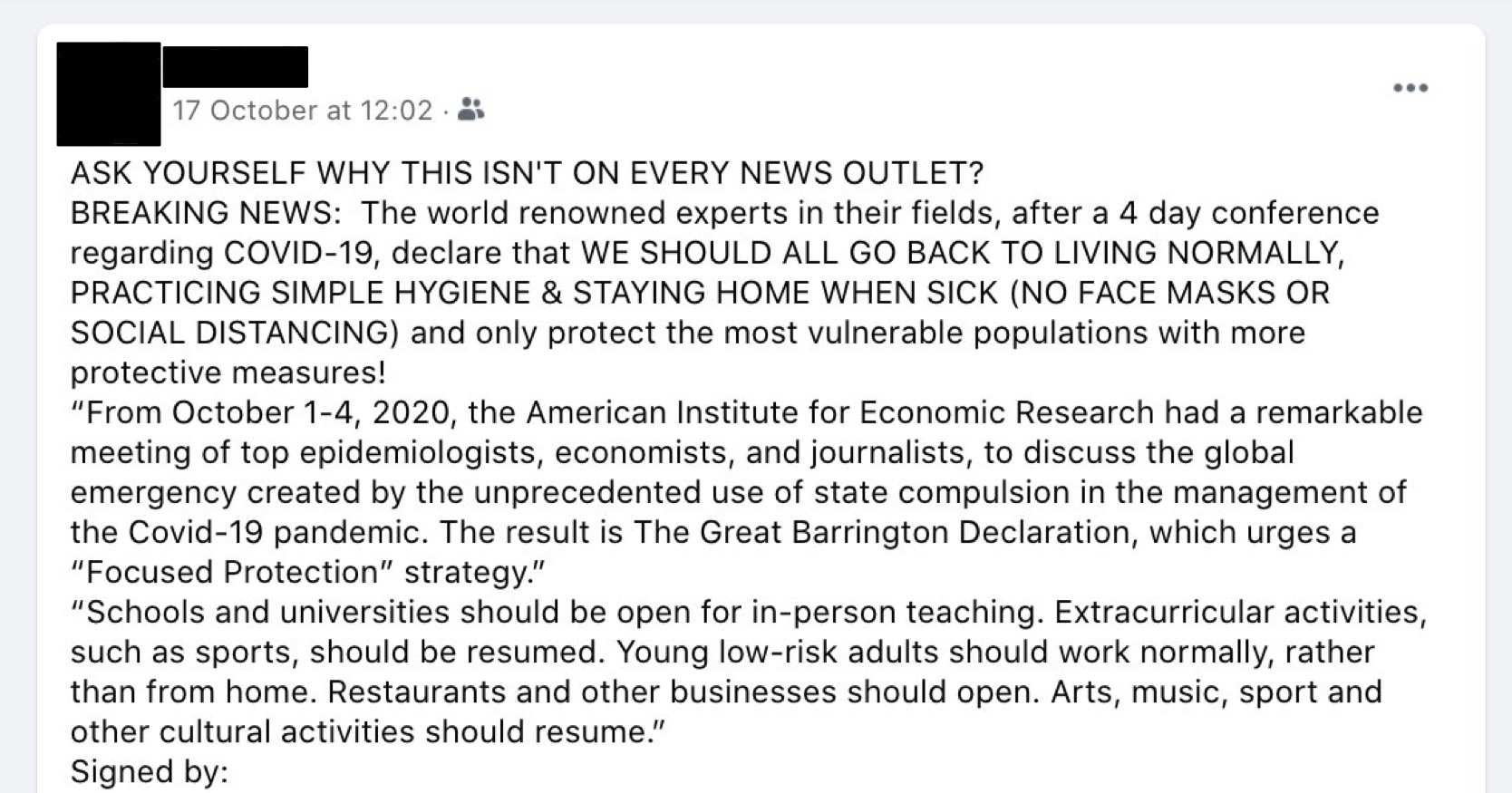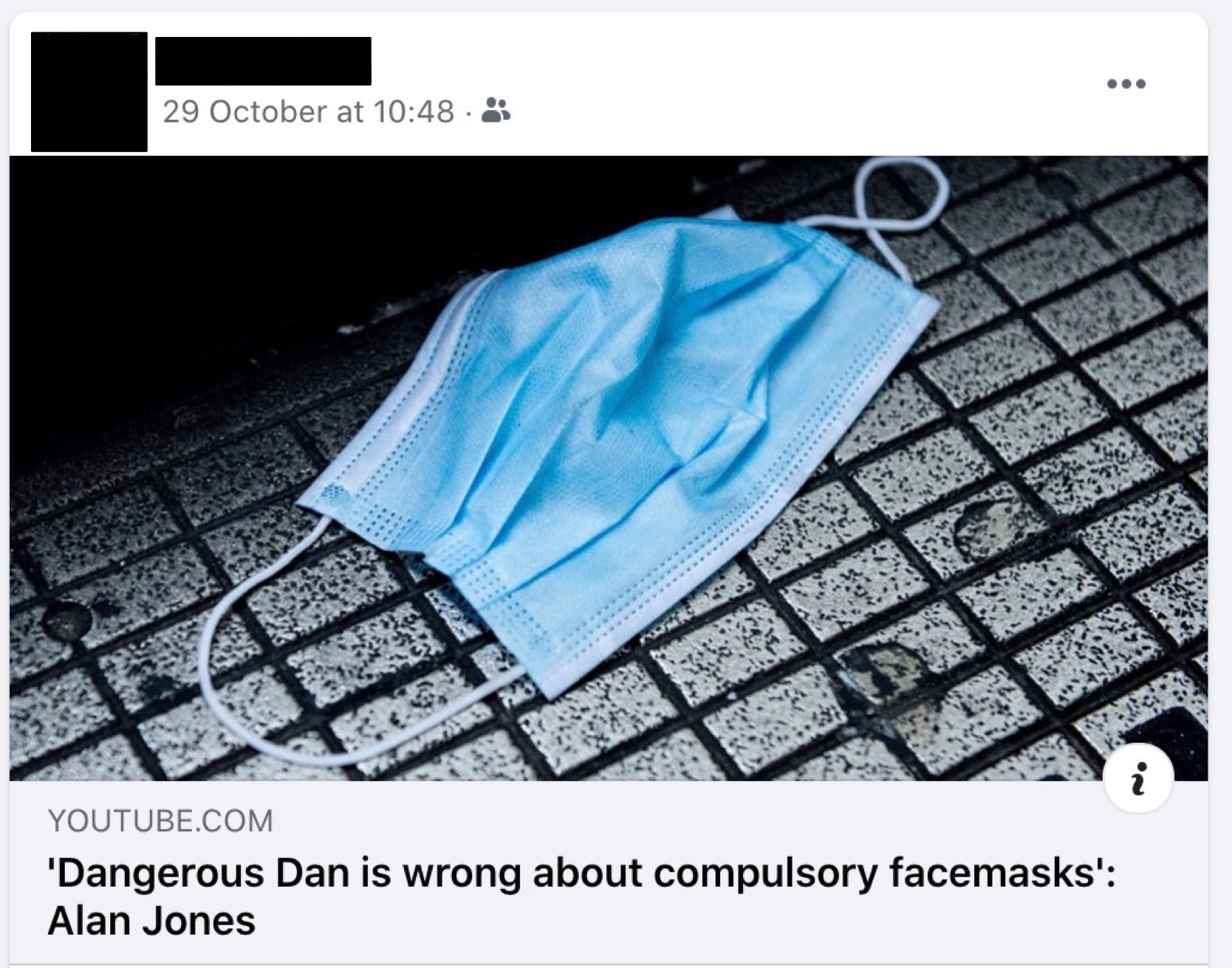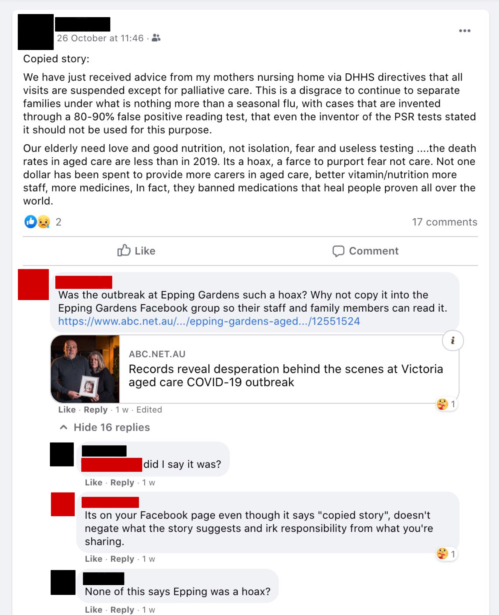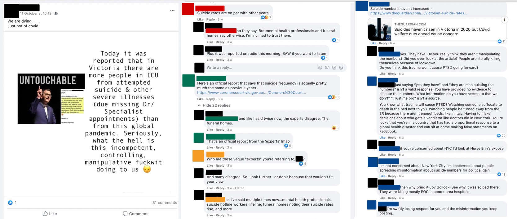 As the pandemic has developed over the course of the year and Victoria has progressed through lockdowns, a Facebook friend of mine from high school has taken to discussing COVID-19 extensively. She posts very regularly (on average between 20 and 30 times per day) with commentary on the pandemic, ranging from sanctimonious to outraged, sharing posts from conspiracy groups, pandemic-denying politicians, and other Facebook users that downplay the existence or severity of the virus. The series of unsubstantiated claims and recurrent mentions of ‘breaking news’ from various unnamed rogue health workers results in some of her Facebook friends querying her content and questioning the validity of her sources. When they reply to her posts, her Facebook friends often attempt to share news articles and updates from verified, fact-checked sources, but when this happens she talks past them, avoids the question, engages in a range of logical fallacies, or outright denies the validity of the information with which she’s been presented. In particular, she received significant backlash from her friends when she shared a post about the Australian suicide rate in 2020, crediting an alleged (untrue) increase directly to the lockdowns: one friend responded to say ‘I’m swiftly losing respect for you and the misinformation you keep posting.’ Earlier in the year, her posts gained greater traction among her Facebook friends: people would react to them, comment with information, speculation, or gentle disagreement; by now (November), the engagement her posts receive has dwindled down to the occasional like, but usually nothing more than that.