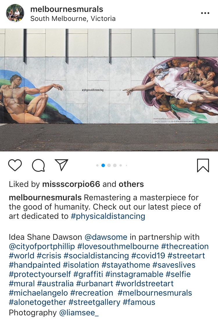 Outside my work the council of Port Phillip commissioned an artwork on Coventry Street South Melbourne by Bridgette Dawson who goes by Melbourne Murals. She remastered the renaissance creation of Adam masterpiece dedicating the work to physical distancing. This piece developed throughout March when social distancing was fairly new and the mural demonstrates the way social distancing impacted everyday life. During this period the council of Port Phillip organised an initiative for property owners to register their buildings to have murals painted on the exterior. This would give artists work during a hard financial time and would deter graffiti. Port Phillip council also created a map for viewing their new street art installations, encouraging new walking paths when life seemed on repeat. I see this artwork nearly everyday and customers continually comment on it and smile about it. It’s a reflection of how COVID changed our lives and the spaces around us in South Melbourne.