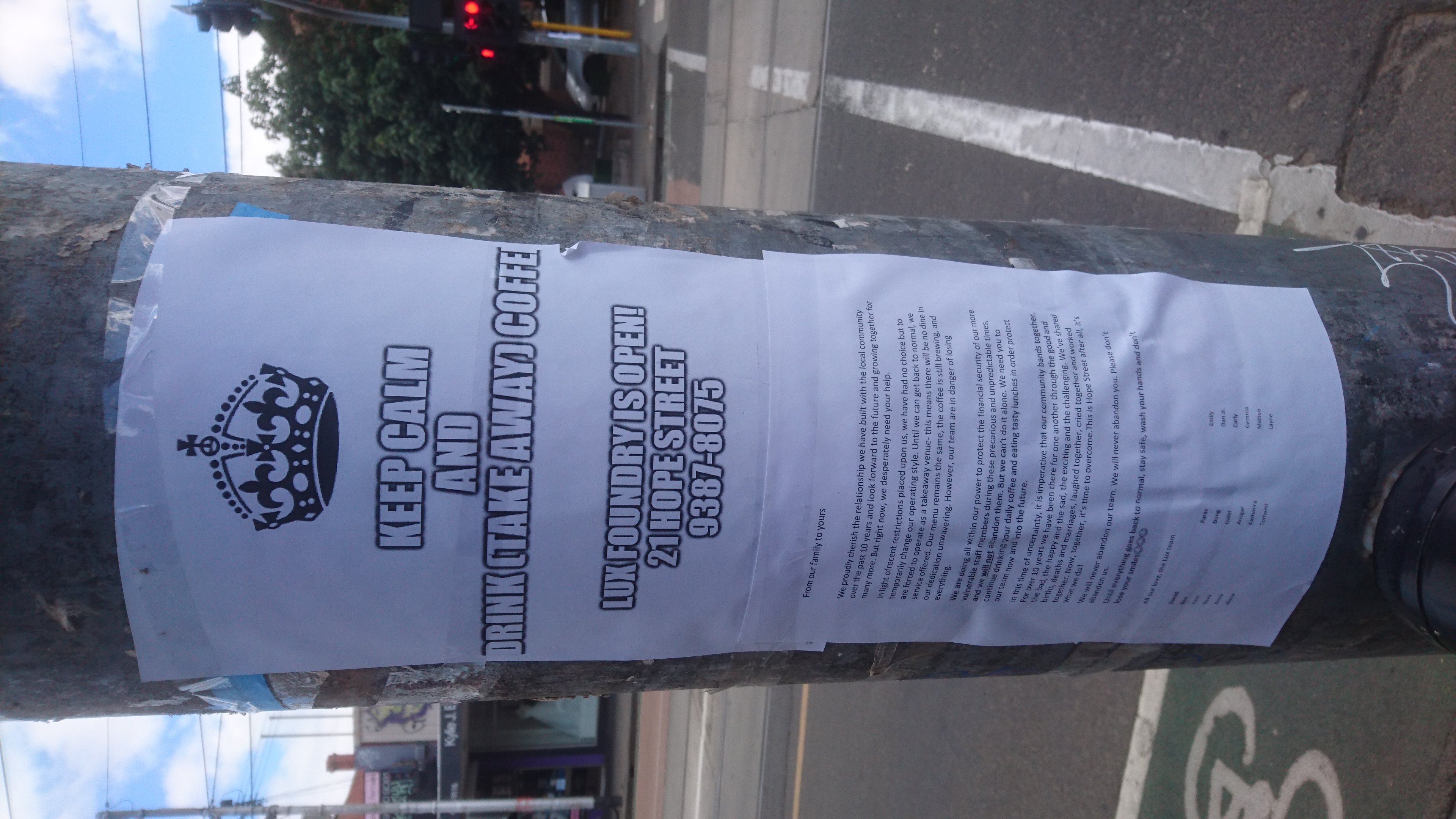 These posters went up around our neighbourhood within a day of the government order that limited all restaurants and cafes to take away service only. The same message was also printed as a paper slip and placed under car windscreen wipers. The business behind the signs is Lux Foundry cafe, located on my street in Brunswick, Melbourne, Australia. The sign pleads with people in the neighbourhood to keep patronising the cafe, so the cafe can continue employing its staff: "We will never abandon our team. We will never abandon you. Please don't abandon us". This poster is a poignant illustration of the economic crisis that was unleashed immediately by the COVID control interventions.