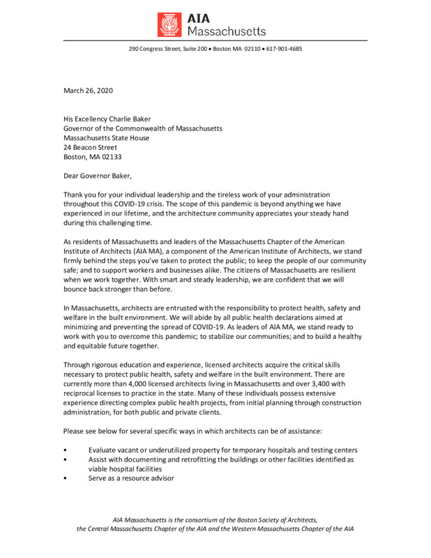 Letter written by the Massachusetts Chapter of the American Institute of Architects r to Governor Baker of Massachusetts asking for in cases where a construction project is designated an essential business the architecture firm also be designated an essential business. #HIST5241