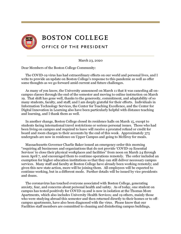 Boston College responds to MA Governor Charles Baker's closure of non-essential businesses