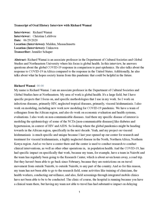 This is an Oral History interview with Dr. Richard Wamai by interviewer Christina Lefebvre from June 29, 2020. Dr. Wamai speaks about the epidemiology of COVID and the global response to it versus other epidemic, as well response comparisons between Africa and the United States.