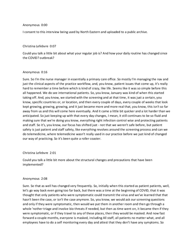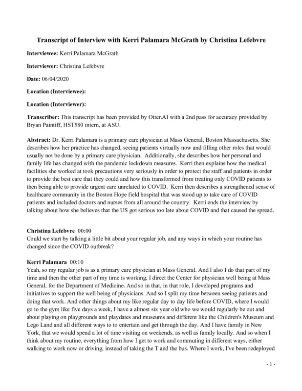 Curator Note: Interviewer, Christina Lefebvre, and narrator, Kerri Palamara McGrath, discuss the impact of the COVID-19 pandemic within healthcare and in the Boston area.