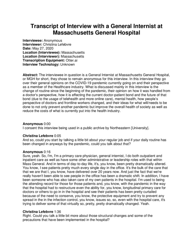 Christina Lefebvre interviews an anonymous general internist at Massachusetts General Hospital about their experience with COVID-19 and the global impact of the virus.