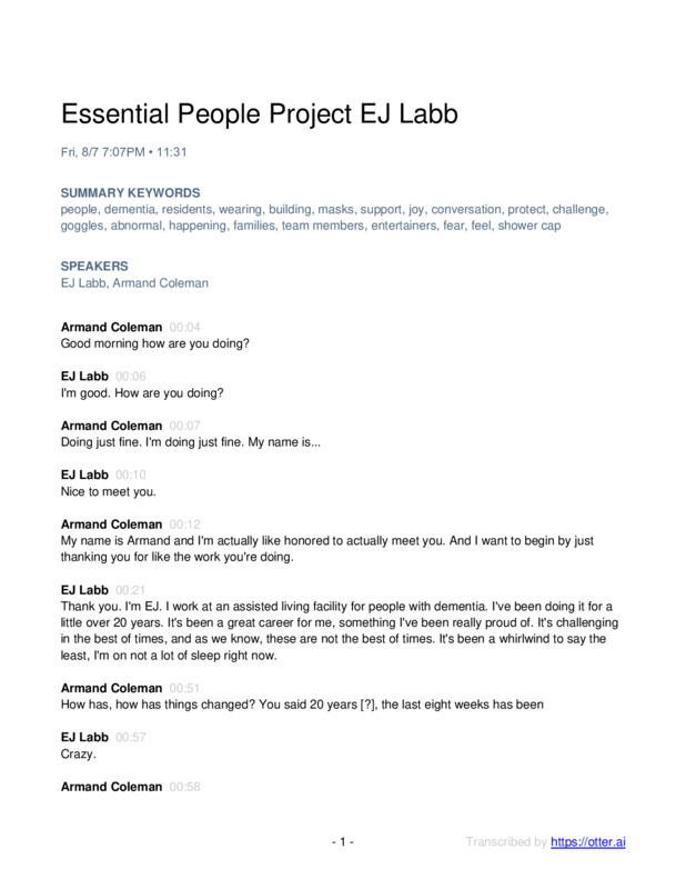 As part of Everyday Boston's Essential People Project, program coordinator Armand Coleman interviews EJ Labb. EJ is the director of an assisted living facility for people with dementia, and the interview features her talking about the "new abnormal" inside her community; the evolution of her own fear; her concerns for her staff; the challenges of communication with residents; and the importance of joy- especially during a pandemic