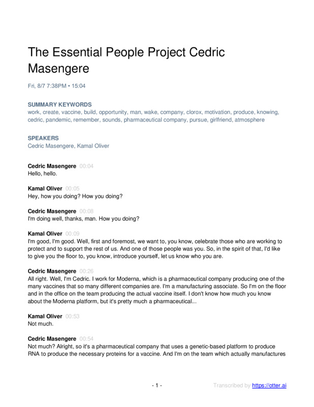 As part of Everyday Boston's Essential People Project, Kamal Oliver interviews Cedric Masengere. Cedric is a manufacturing associate at Moderna, and the interview explores his journey from an 8-year-old playing with chemicals in his bedroom to the floor of the pharmaceutical company working to produce a vaccine during the pandemic.
