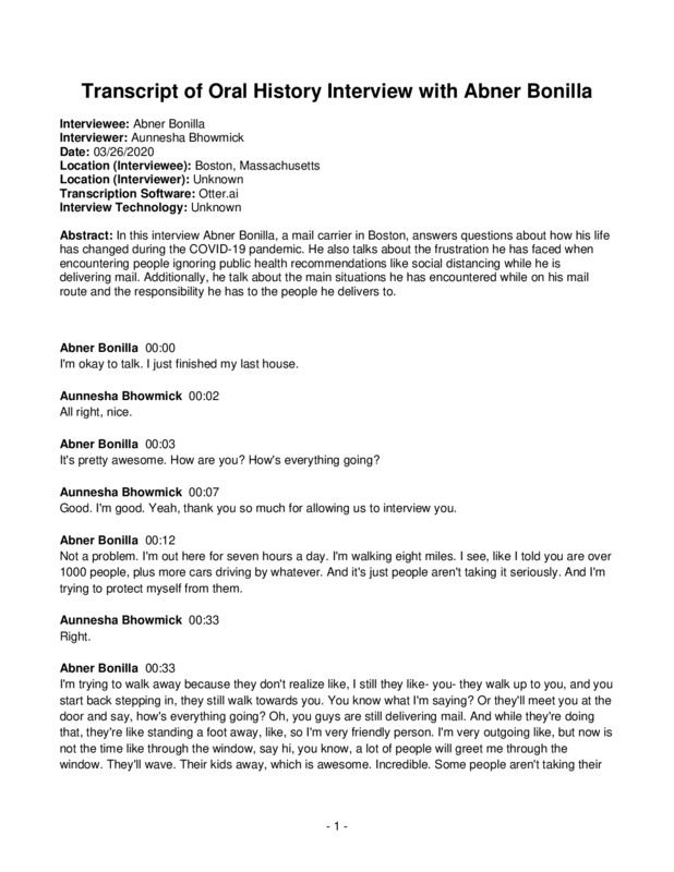 As part of Everyday Boston's Essential People Project on YouTube, Aunnesha Bhowmick interviews Abner Bonilla, a Roslindale mail carrier. Abner describes what it's like to deliver mail to more than 1,000 people during a pandemic, including his concerns about the lack of social distancing; his worry for his elderly customers; and the outpouring of gratitude he and other mail carriers have gotten.