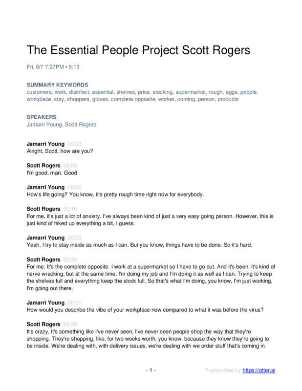 As part of Everyday Boston's Essential People project, Jamarri Young interviews Scott Rogers. Scott is a grocery worker, and he describes what it's like to stock the shelves during a pandemic, including the early days of panic buying, his appreciation for his coworkers, and how he misses interacting with his customers