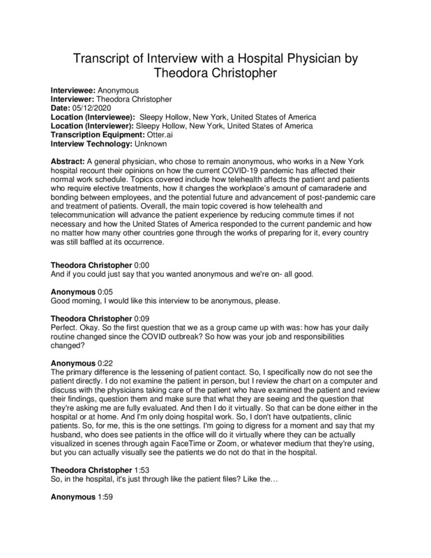 An interview with a practicing physician in a hospital, discussing changes in protocols and practices due to the Covid 19 Pandemic.