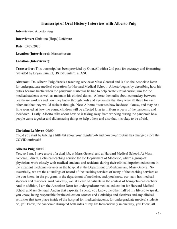 Oral History project from Northeastern University. Christina Lefebvre interviews Alberto Puig. Alberto Puig teaches at Mass General and at Harvard Medical School. At Mass General, he directs a clinical teaching service for the Department of Medicine, where a group of physicians work closely with medical students and residents during their clinical inpatient education in the inpatient medicine services in the hospital at the Department of Medicine and Mass General. The team takes care of patients in the context of being clinical teachers.