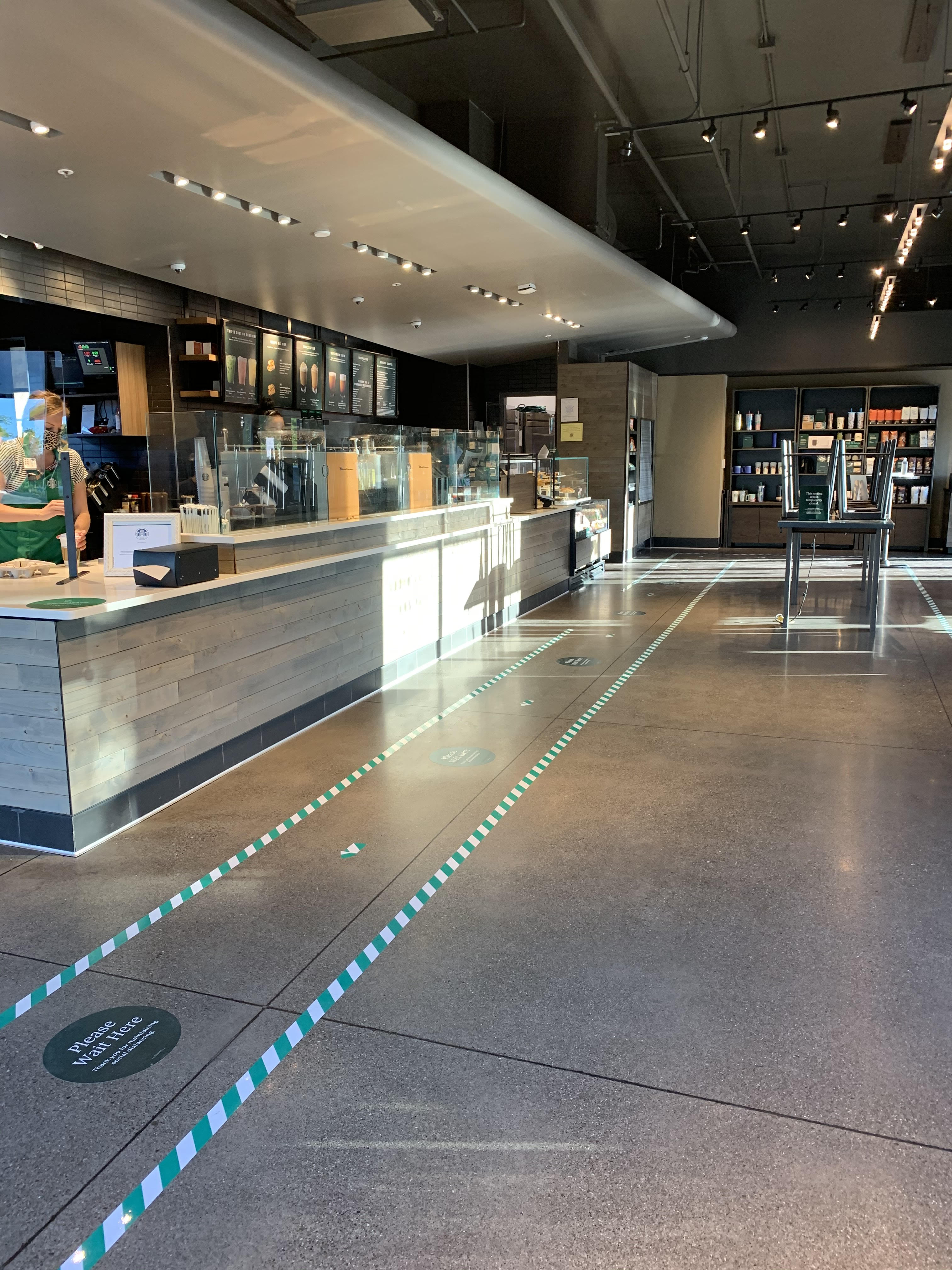 Shelter in place has been lifted. I decided to go inside Starbucks for the first time in months. The chairs and tables are now against the wall. There is a path marked for patrons that guide people from the door, then counter, then pick up, then exit out a different door. There is plexi-glass around the entire work area. The employees have a log-in station by the front door where they must wait until another barista comes to take their temperature before they are allowed to work (with a mask).