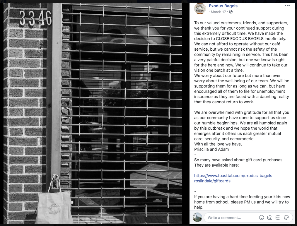 Exodus Bagels is a black-owned business in the Jamaica Plain neighborhood of Boston, MA. This Facebook post is an announcement on March 17 that Exodus Bagels would close indefinitely due to the pandemic.