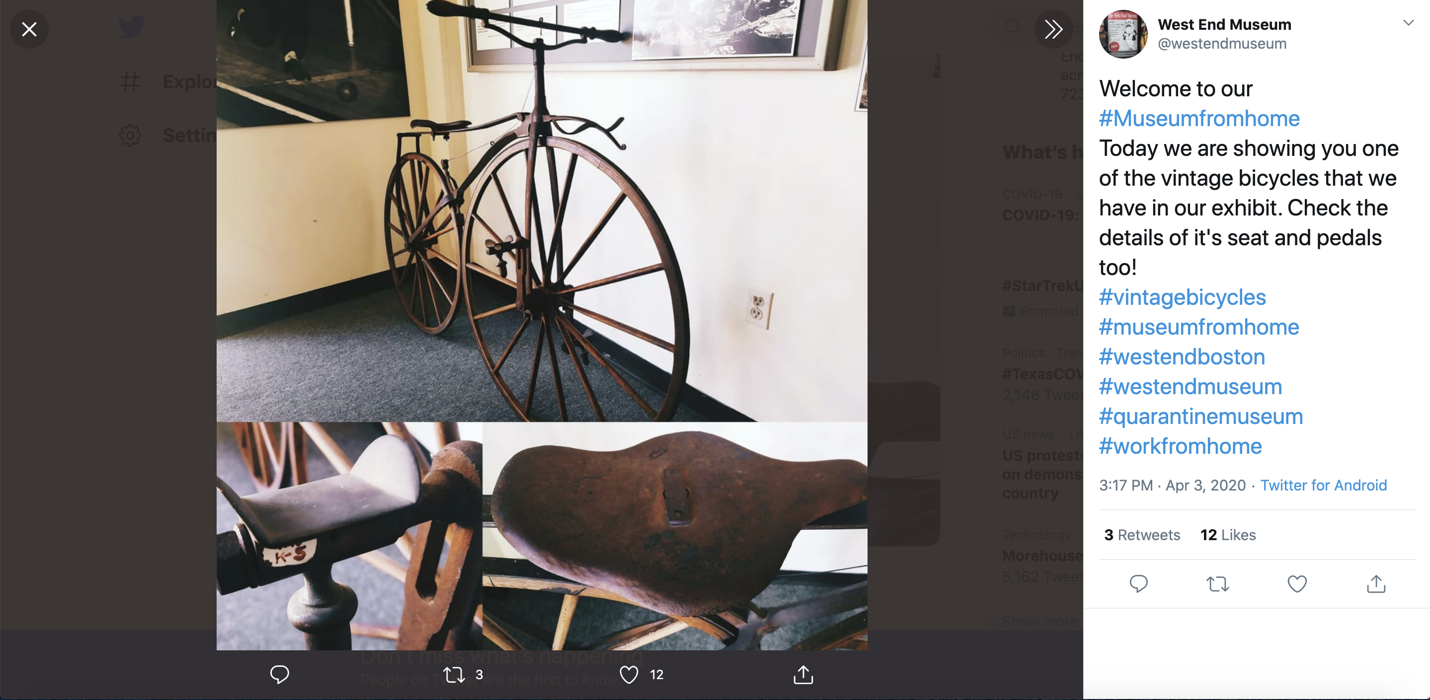 Post on the Twitter page of the West End Museum, highlighting an antique bicycle from their collection. The museum's then-current exhibition focused on cycling, and the role women played in the development of cycling as a pastime and means of transportation. Social media posts using #MuseumFrom Home became a crucial way for museums to interact with the public and was accessible to all institutions regardless of their size.