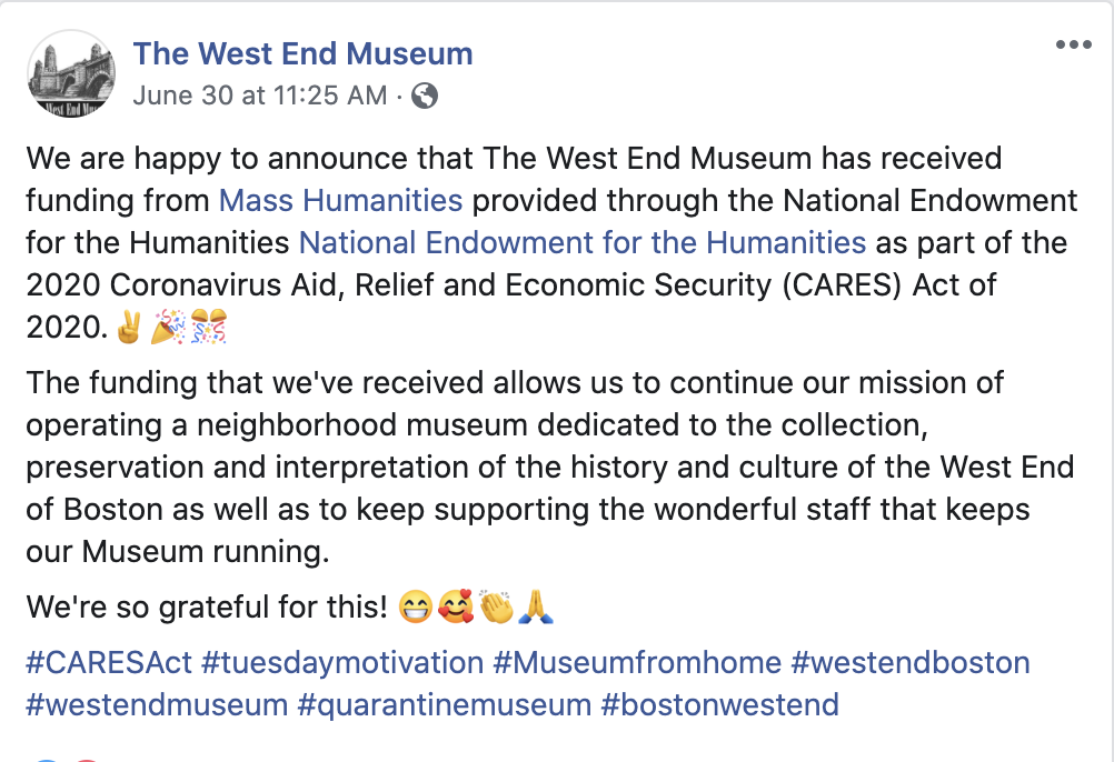 Announcement by the West End Museum in Boston that they have received funding from the National Endowment of the Humanities through the Coronavirus Aid, Relief and Economic Security (CARES) Act of 2020. The post discusses what the museum hopes to do with these funds, and how the funds will support them and their staff during the pandemic. As museums struggle to remain financially solvent through closures, grants and other funds have become a vital lifeline. This is especially true for small institutions that lack the large funds of major institutions.