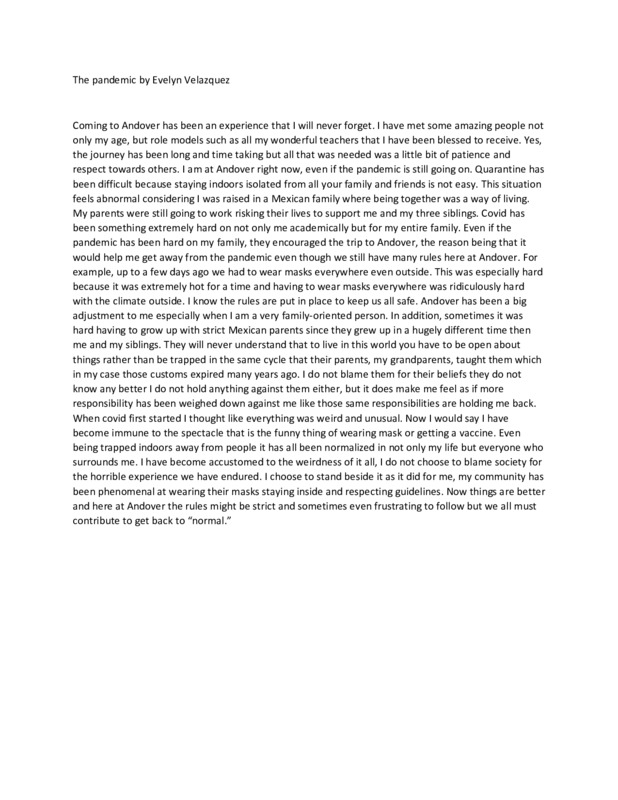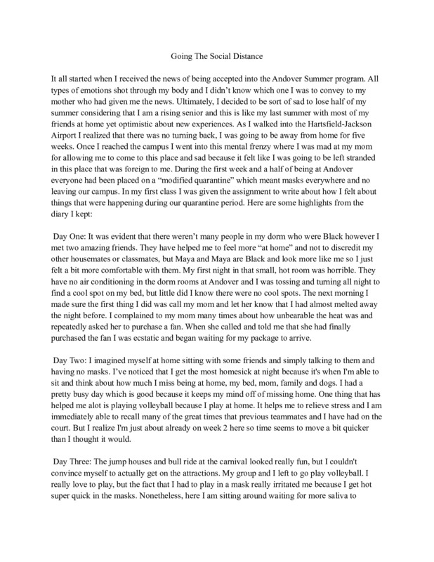 My submission to the Journal of the Plague Year is a reflection on the process of writing diary entries about living through a quarantine period at my summer program at Phillips Academy Andover. It talks through my feelings of anxiety and guilt, as well as feeling a sense of distance from the rest of the world during the seven day period, and explains how keeping a diary can help you understand your own emotions during a difficult time. -