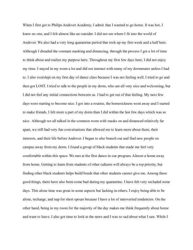 My name is Maya Watt, I am 17 and I am from Memphis, TN. I am currently attending Phillips Academy Andover during their Andover Summer program before senior year. I have met many people, learned new things, and worked on my worth ethic. This is the story of my quarantine during my first week and a half at the camp. There are some highs and lows, but throughout my slightly rough quarantine/transition into the camp, I realized the purpose of my attendance at this school. -