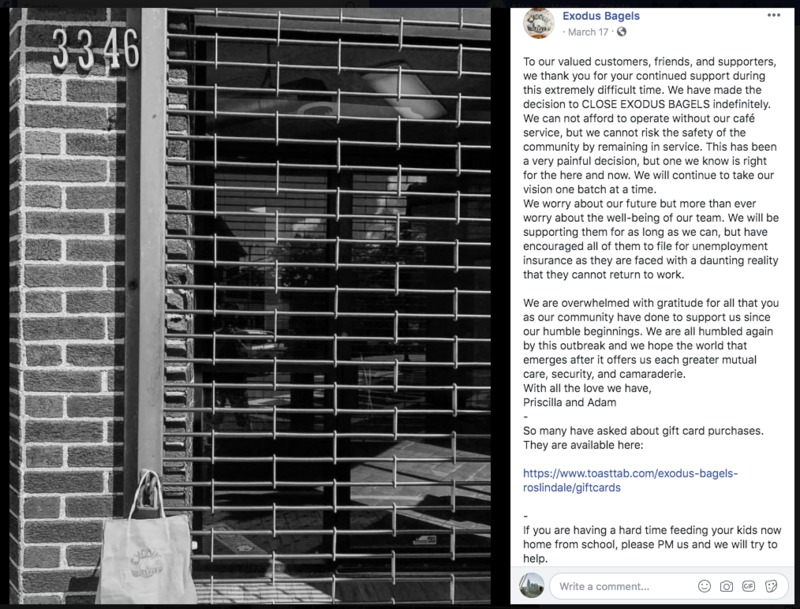 Exodus Bagels is a black-owned business in the Jamaica Plain neighborhood of Boston, MA. This Facebook post is an announcement on March 17 that Exodus Bagels would close indefinitely due to the pandemic. -