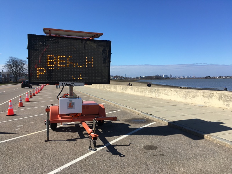 Color image of electronic sign noticing closure of public beach and parking lot-Wollaston Beach-Wollaston, MA -