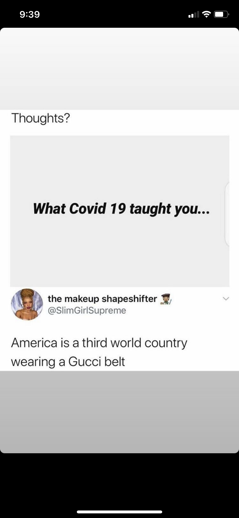 Have you ever seen a person roll up in an expensive car to later find out they rotate between friends couches at night? Or a girl with a channel purse riding the bus? I thought of both when I came across this meme on Instagram. Since the Second World War, the US has posed as the leader of the world. We’ve boasted economical sucess, technological advances and number one in the sciences. Then COVID hit and our true colors came out. I wouldn’t go as far as this meme and claim that the US is a third world country because we’re clearly not. But we’re also not number one like we pretend to be. We were on top of the world is everyday back in 1945, but that spot is not ours anymore. The current administration has proven inapt in ever sense of the word. And now the world sees us as the posers we’ve become. I’m hoping for better days after these elections.