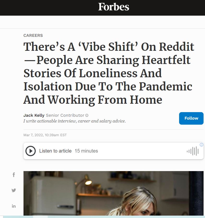 This is a news story from Forbes by Jack Kelly. This story is about loneliness felt from isolation that people are discussing on Reddit. Subreddits like r/antiwork and r/wallstreetbets, a lot of these conversations are sharing details about their feelings they might not want to share elsewhere. Since Reddit allows people to submit anonymously, it gives others an environment they can give more details on subjects they maybe wouldn't tell to even their family members. Some of these discussions are about those that are single and work from home, which creates a very solitary experience. One woman, 27, on Reddit describes trying to join Facebook groups and do online dating to have more interaction during the pandemic. She says she felt a slight panic seeing her other friends get married, have kids, or engaged, which made her feel even lonelier. Others describe the challenges with finding remote work and needing support to help cope with that hardship. The lack of socialization has had massive effect on young adults just starting out in life, and it has given some worse mental health as a result. While some might thrive with being alone, others have suffered. Another woman, 32, says that prior to the pandemic, she was a 'social butterfly' and outgoing, but is now antisocial and a shut-in. She says that she lacks the motivation to go places like she used to. In addition to this, her place of employment is considering permanent work-from-home for employees, making some of those social struggles even worse. Some Redditors ended up giving advice for people that shared stories like these, such as smiling every day towards someone, or going outside for 15 minutes or longer. Simple things like this were common suggestions to help with some people's mental health issues induced because of the pandemic isolation. I think that this story helps show some of the negative effects young people have had with readjusting their entire lives, and then feeling lost once they get too used to it when things are starting to go back to "normal."