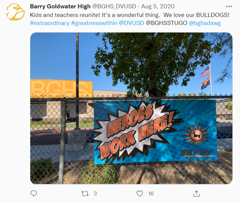 This is a screenshot from a public high school's Twitter page. The photo is of a sign posted in the front of the school that says "Heroes Work Here". These signs were posted throughout the Deer Valley Unified School District at the beginning of the 2020-2021 school year in order to celebrate the work of teacher's who were started the year virtually and would transition to in-person.