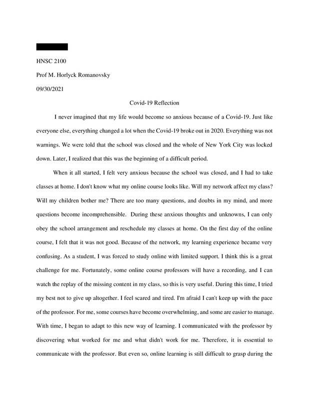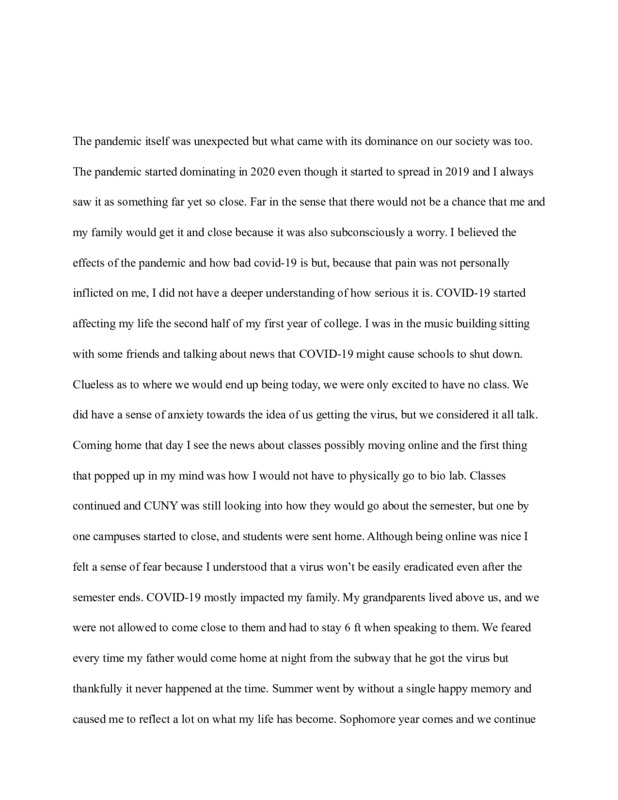 My covid experience this year is probably a lot like others. I've lost family members to this pandemic my close friends lost loved ones as well. There are a plethora of people I know who have lost their jobs, gained severe diagnosis of anxiety and also depression. Being stuck in the house for all those months with family was a very strenuous task and it was also very debilitating as well. While the covid outbreak started my family and I were sent into a frenzy mentally and physically. My mother lost her job due to the pandemic and I had to pick up more hours at work and do other side jobs to somewhat help with the expenses as well also during this pandemic i was also in school. Attending Brooklyn College during the pandemic was a very difficult thing to do especially due to the fact that we had transitioned to online learning, something I or my teachers haven't really done in some time. The social distance learning that was implemented was a very difficult concept to grasp because one day we go from attending class everyday to the bombardment of information being thrown at us and us as students expected to keep up and also the teachers having to make sure they kept up with the requirements. School, going to work and worrying about the well being of others and myself put me into a state of worry at all times sort've giving me mild ptsd. I hope that this time next year this covid situation will be gone and we can go back to living the way we were.