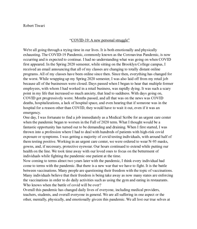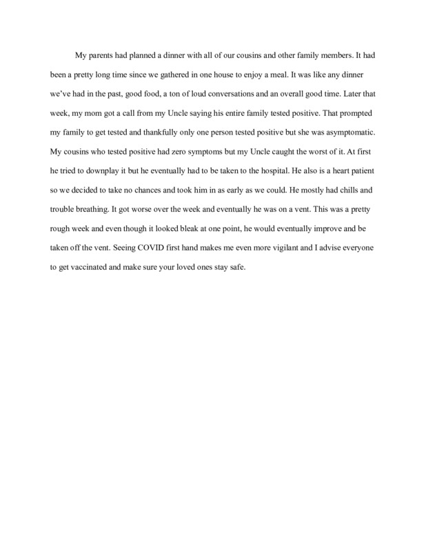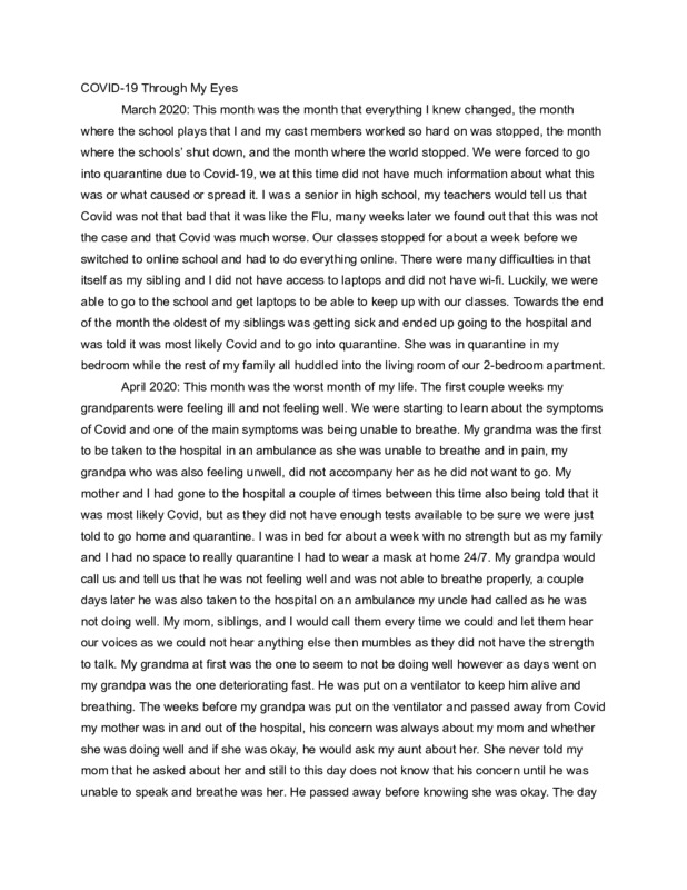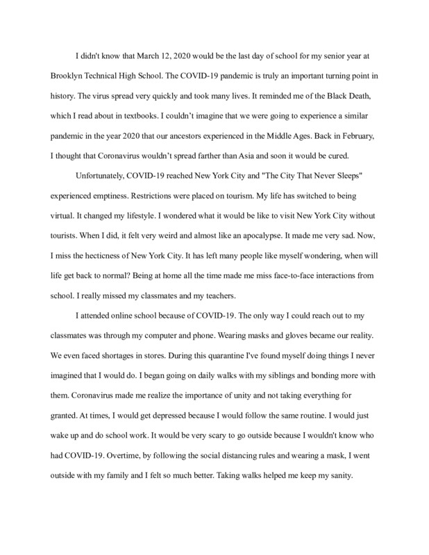 The item that I am submitting is the story of my experience of Covid-19, what my family and I went through and how we have pushed forward and persevered despite the many difficult challenges we faced the past year. This is important to me as it tells my story through my point of view, my journey through what I consider to be the hardest moments of my life.