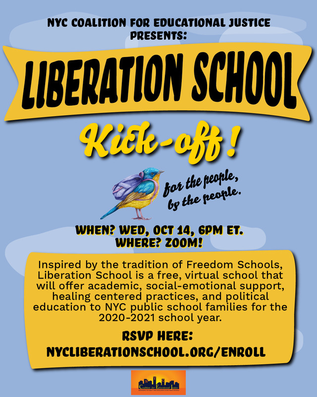 Liberation School was a free, virtual online school that offered academic support courses, social-emotional support, healing centered practices, and political education courses to NYC public school families throughout the 2020-21 school year. Created by the NYC Coalition for Educational Justice, the city's largest parent organizing group, Liberation school was designed as a response to the failings of the Department of Education to adequately provide the resources and support needed for marginalized students.