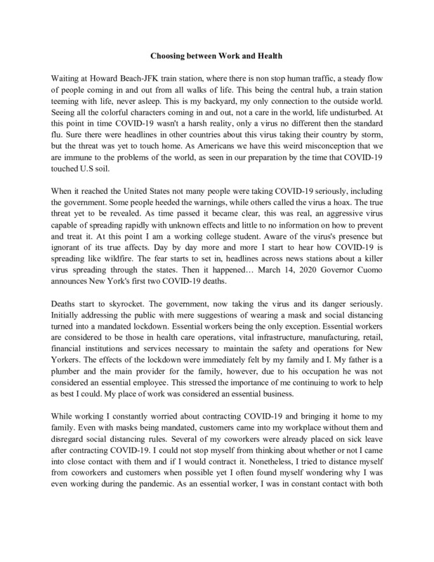 This short piece shares the struggles and experiences of choosing between working as an essential worker and worrying about my family's health during the peak of the pandemic.