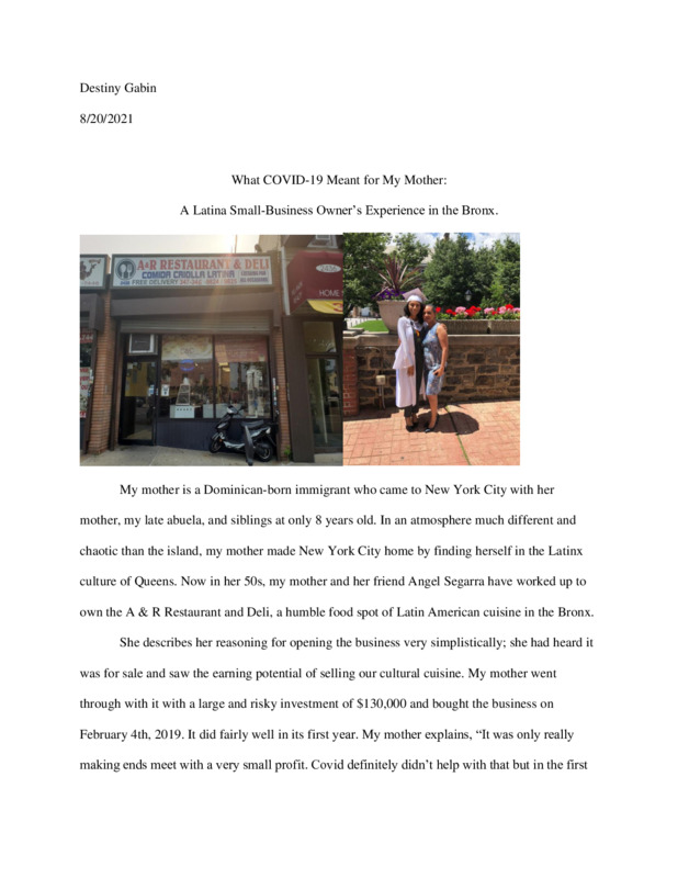 The item I am submitting is a pandemic auto-ethnography detailing the disproportionately negative impact of COVID-19 on Latinx businesses. I do so through the narrative of my own family's experience, specifically my mother, as well as supporting academic research of general demographic trends. This piece speaks to how the pandemic, while in and of itself does not discriminate, has proportions of its impact that demonstrate a systemic bias leaving certain racial and ethnic groups less protected and far more targeted than others. The piece also connects how these discrepancies are not products of the pandemic, but rather were already systemically there and exacerbated by the pandemic.