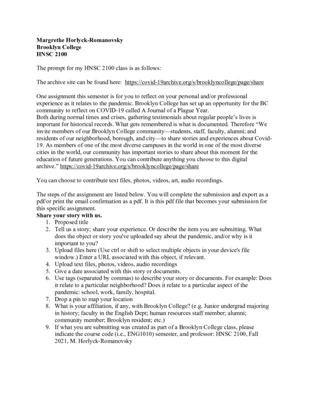 Brooklyn College HNSC assignment prompt, taught by Margrethe Horlyck-Romanovsky