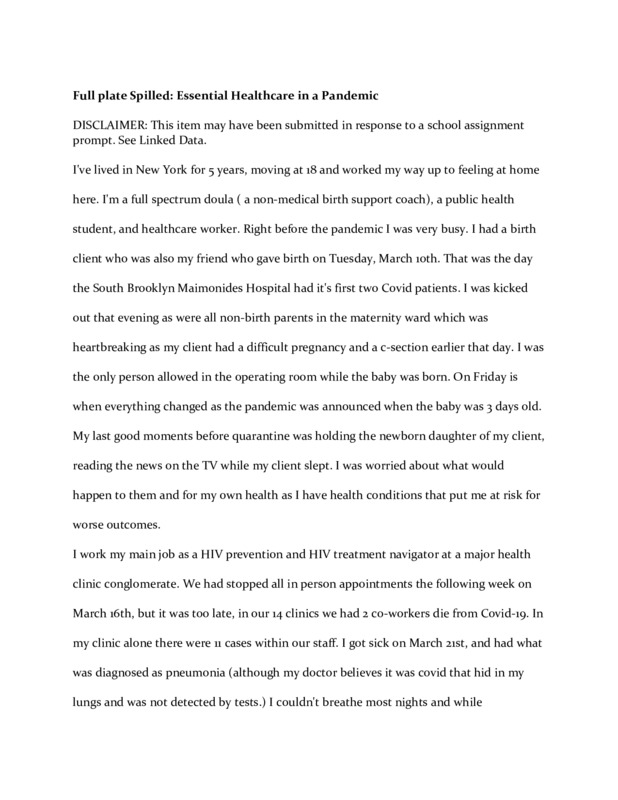 I work my main job as a HIV prevention and HIV treatment navigator at a major health clinic conglomerate. We had stopped all in person appointments the following week on March 16th, but it was too late, in our 14 clinics we had 2 co-workers die from Covid-19. In my clinic alone there were 11 cases within our staff. I got sick on March 21st, and had what was diagnosed as pneumonia (although my doctor believes it was covid that hid in my lungs and was not detected by tests.) I couldn't breathe most nights and while quarantined at my friend's two bedroom apartment I found my fingers and toes turning blue and had a fever of 102 for over a week. My job was in chaos, half staff people working from home, and all essential staff coming in to report in person. Just two weeks after getting ill and still recovering from pneumonia I had to return to do in person care at the peak of NYs Covid-19 first wave. Due to a loss in funding we did not and still do not receive any hazard pay to come in. In my first two weeks back, my godfather's healthy mother died of covid, my high school best friend's mother Carolyn died of covid on March 28th and on April 6th her brother Thomas died on his 30th birthday. By May 1st I was still going to work every day and had lost 8 people in my life to Covid-19, such a high number that I still haven't come to terms with. I have recovered from my pneumonia and thankfully have now tested negative for covid 5 times since March, however the fear is still there if I were to get it from my in person patients. I had to stop doing doula work, which is a passion of mine. However there have been some positives to make things a little easier. I became a godmother. My client's baby is 6 months old and thriving. I'm fortunate to be employed during a time of such financial upheaval. I am also fortunate enough to be in therapy for my mental health which has suffered during this time. I hope this pandemic ends soon and wish no one will have to endure what I've had to go through.