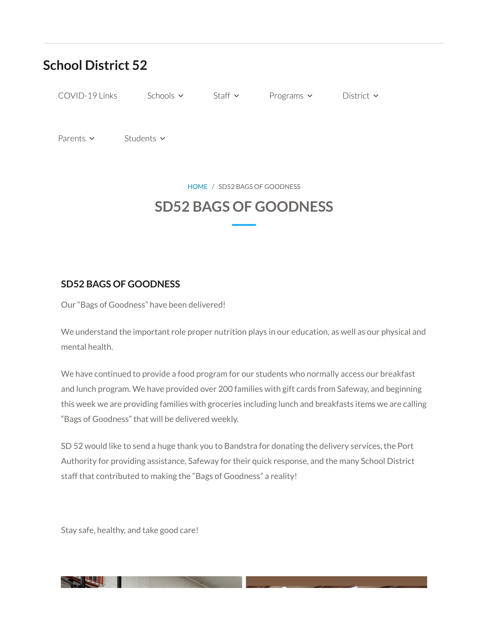 A post with photos of the food program implemented to supply food to kids in School District 52, Prince Rupert, BC. Photos show volunteers preparing over 200 hundred bags of food and gift cards for families struggling amidst school closures and stay-at-home orders. The post appeared on the Prince Rupert School District website.