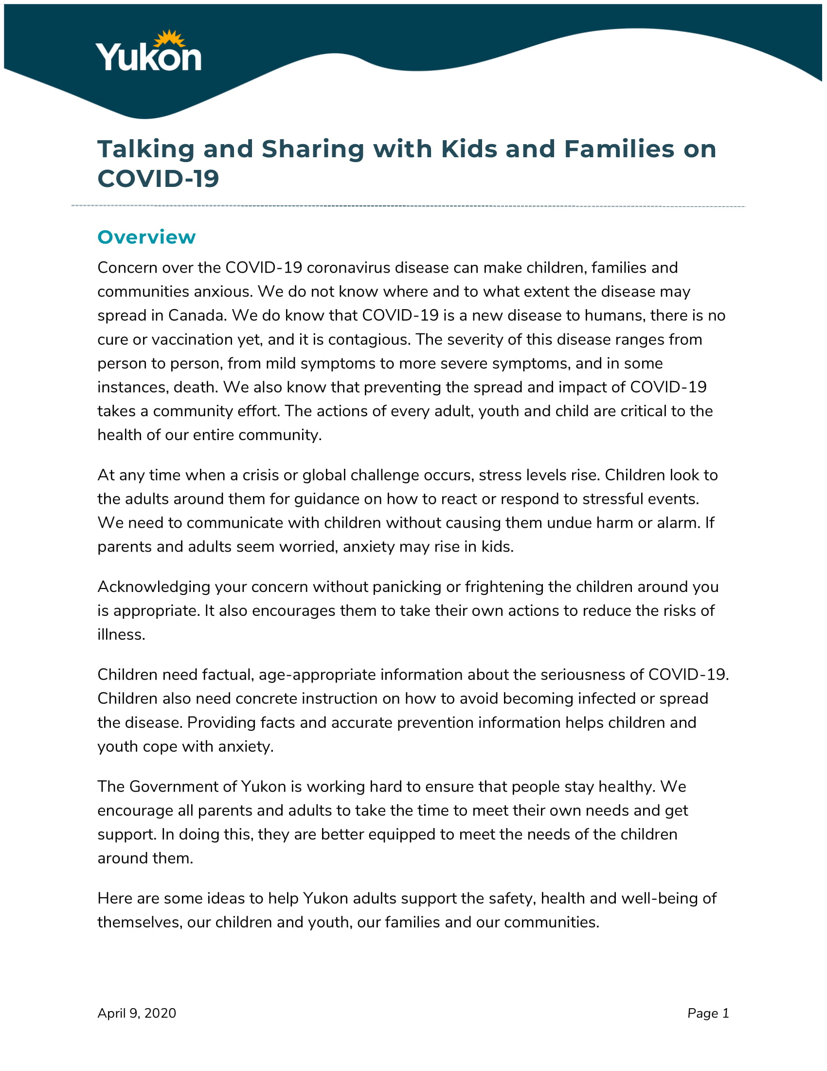 A letter from the government of the Yukon to families outlining ways for them to speak to children and cope with both the medical and emotional needs of Covid-19. It offers ideas and techniques for normalizing lives and homeschooling students of different ages. It also gives descriptions of symptoms to look for, ways to teach students hygiene, and methods to prevent the spread of the virus.