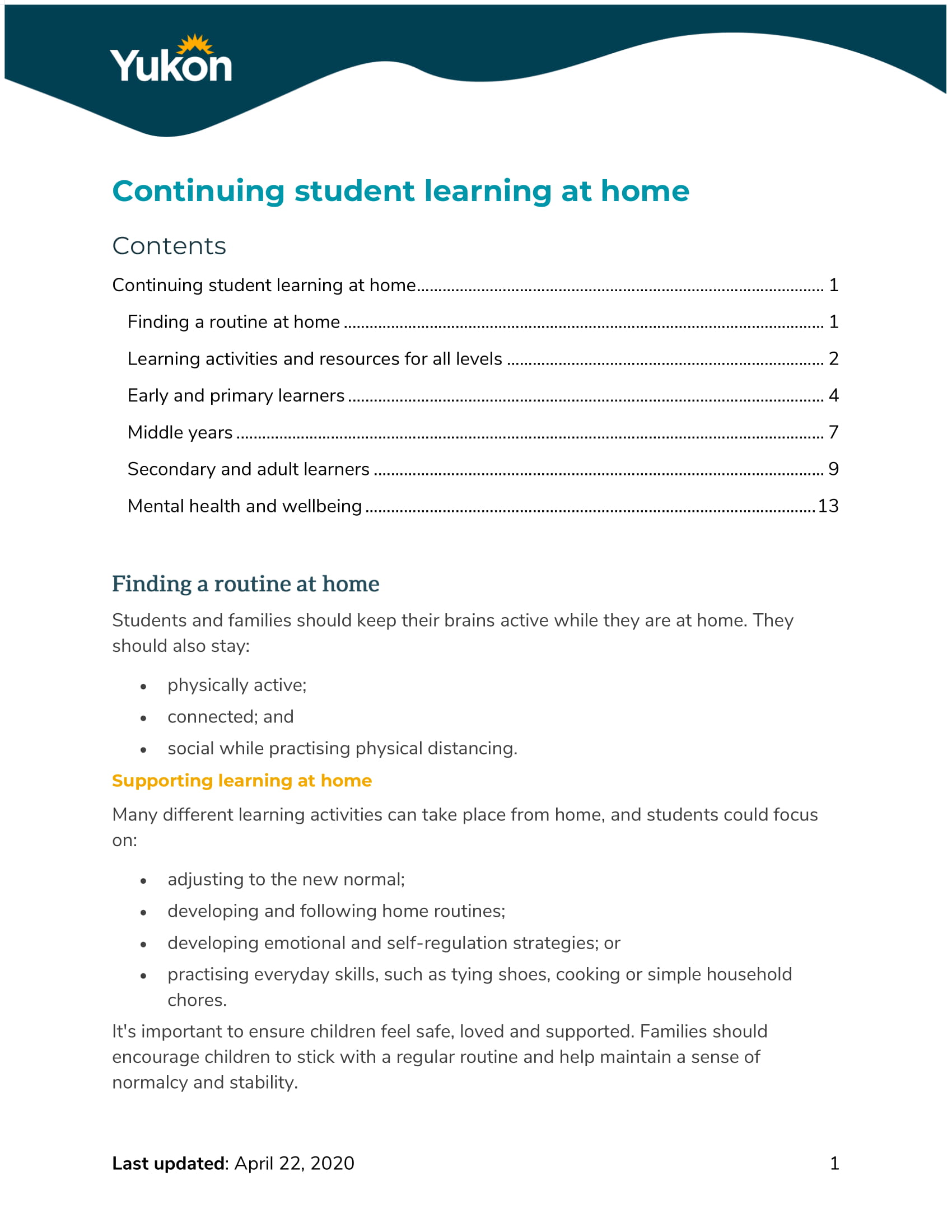 A letter from the Government of Yukon offering ideas, resources, and potential lessons for students and families to continue education during school closures. The letter offers numerous ideas for students of all ages, including on-line resources, and ways to incorporate learning into everyday activities such as cooking, gardening, and caring for siblings or elders in the home.