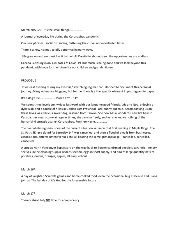 I have been writing a diary of sorts but mainly just ordinary daily events not a 'pandemic' diary.