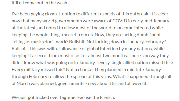 I've been paying close attention to different aspects of this outbreak. It is clear now that many world governments were aware of COVID in early-mid January at the latest, and opted to allow most of the world to become infected while keeping the whole thing a secret from us. Now, they are acting dumb, inept. Telling us masks don't work? Bullshit. Not locking down in January-February? Bullshit. This was willful allowance of global infection by many nations, while keeping it a secret from most of us for almost two months. There's no way they didn't know what was going on in January - every single allied nation missed this? Every military missed this? Not a chance. They planned in mid-late January through February to allow the spread of this virus. What's happened through all of March was planned, governments knew about this and allowed it.