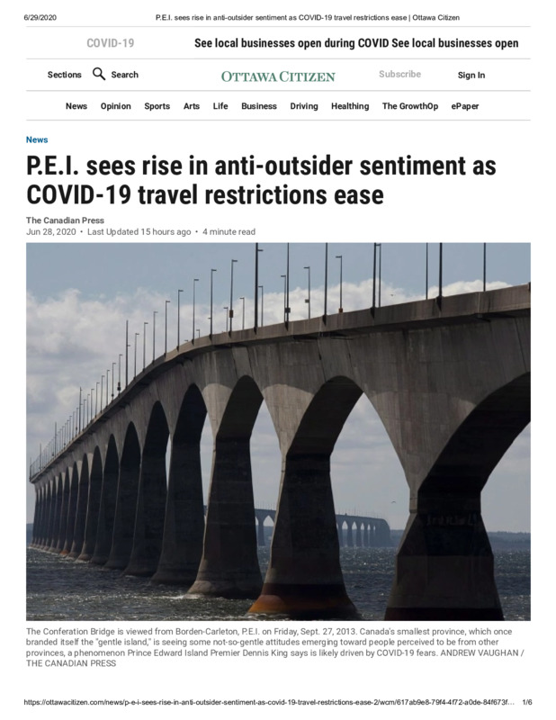 Article discussing hostility from locals to those with out of province license plates as they fear they may be carrying coronavirus into Prince Edward Island.